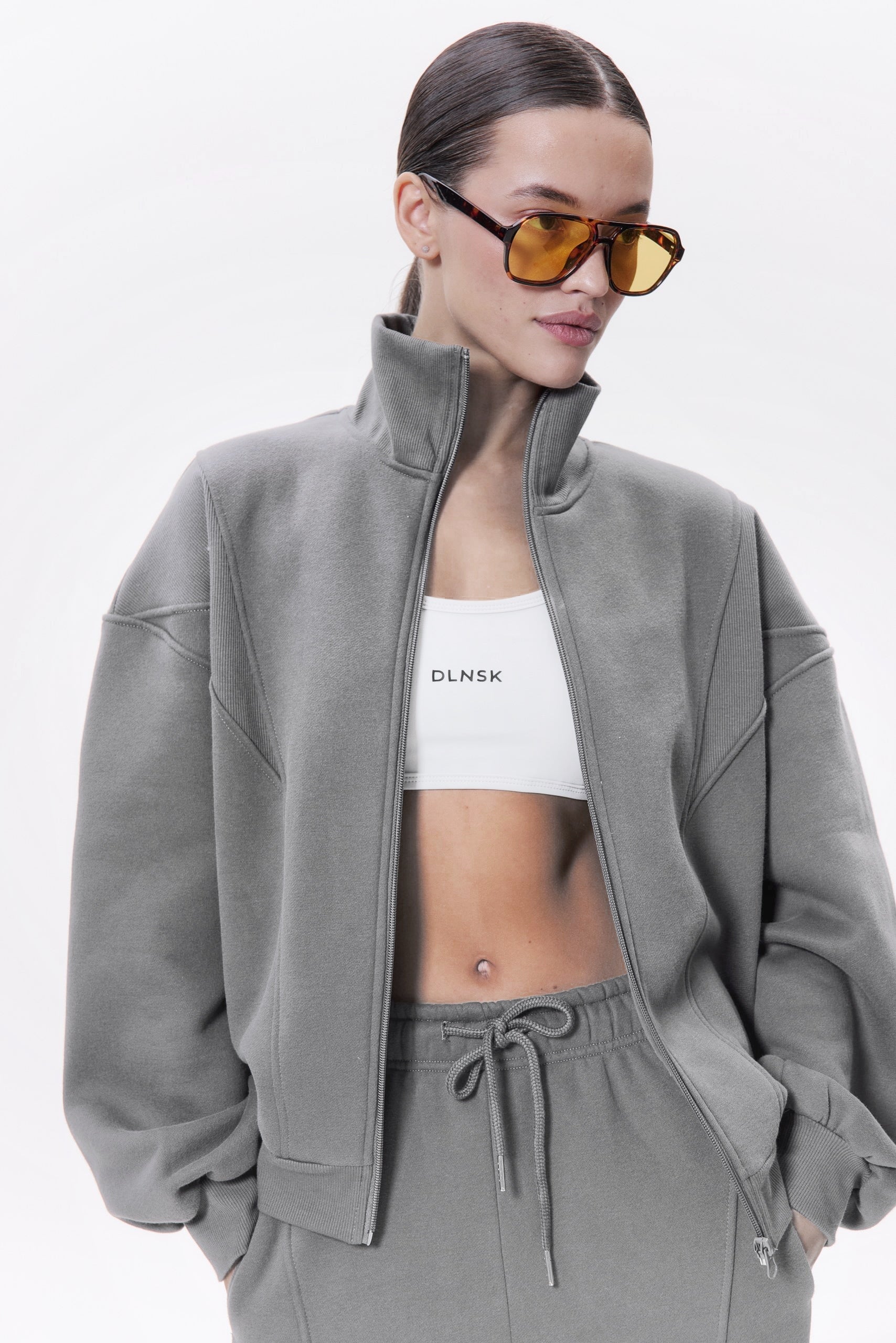 AURA zip-up jacket that blends sport and sophistication. Designed with a relaxed fit and soft, structured cotton, it brings a clean, minimal look that pairs perfectly with wide-leg trousers. Effortless to style — from laid-back mornings to city days.